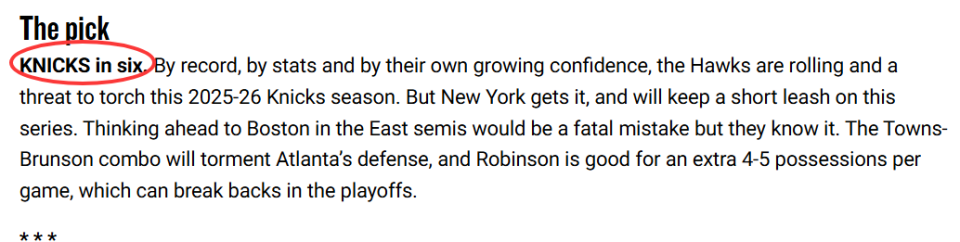 但尼克斯经验更足,会在系列赛中牢牢把控局势。提前想着东部半决赛对阵凯尔特人会是致命错误,而他们很清楚这一点。